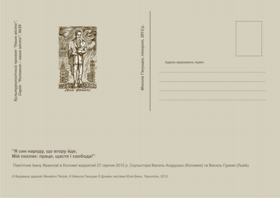 Автором листівки є коломийський лікар Микола Ганущак, який представив громаді своє авторське бачення пам’ятника, хоча в оригіналі пам’ятник має інший вигляд.