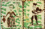 | Автор невідомий. Кахлі "Жінка з граблями", "Скрипаль". Кінець ХVІІІ ст. Глина, розпис, полива. м. Коломия |