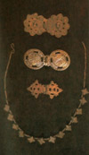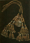 Автор невідомий. Прикраса для капелюха. Початок ХХ ст. Шкіра, метал, інкрустація. с. Шепіт Косівського р-ну. Чільце. ХІХ ст. Тканина, метал, штампування. Верховинський р-н. |