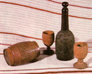 Пляшка. Друга половина ХІХ ст. Дерево, різьблення, малювання. Чарки - "порції". Дерево, різьблення. с. Яворів, Косівського р-ну. |